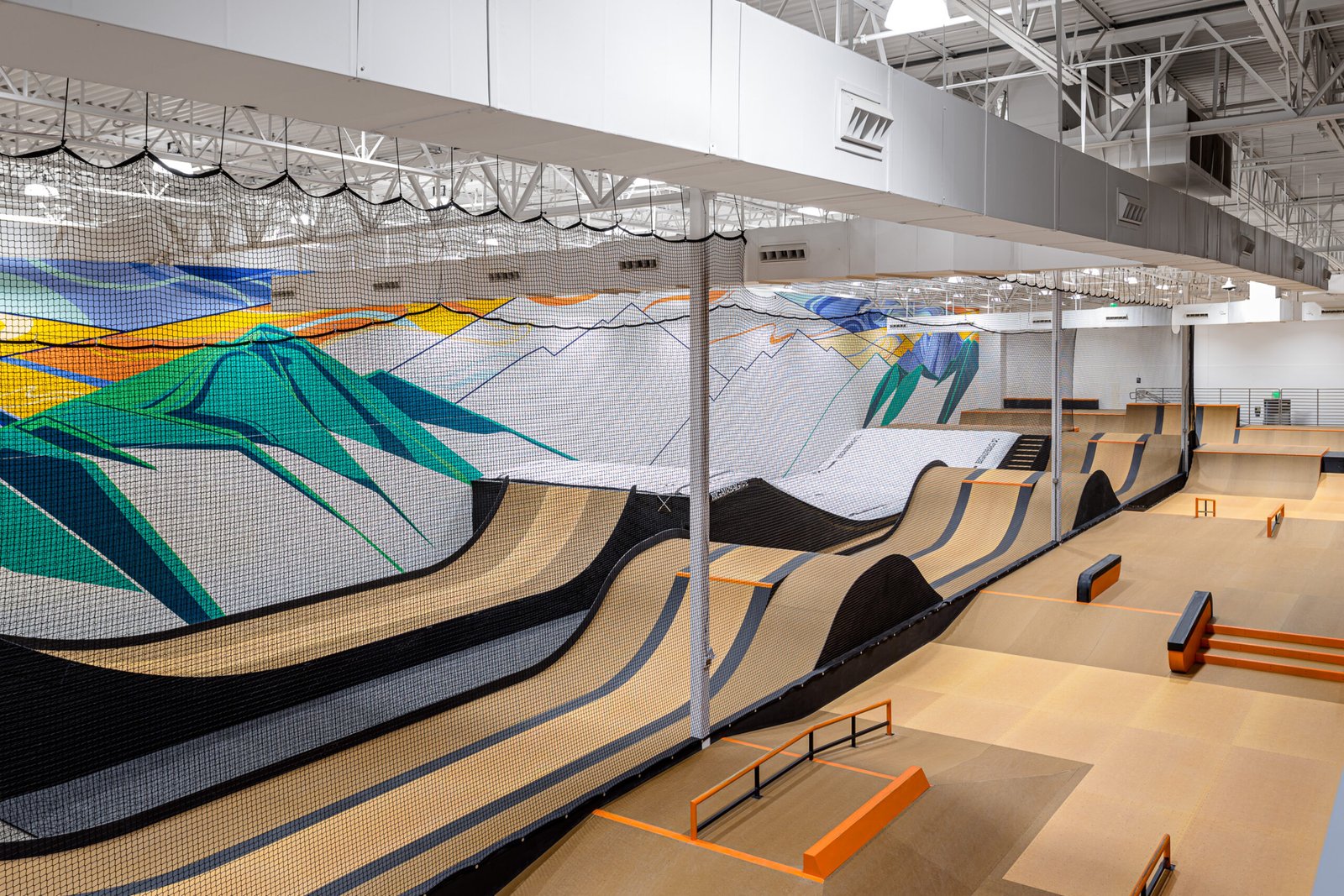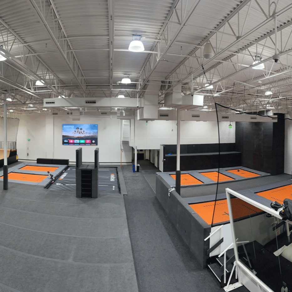 SNÖBAHN Thornton is a 38,000-square-foot indoor action sports center offering year-round ski and snowboard training on revolving slopes, plus skate, freestyle trampolines, airbags, and coaching programs for all ages and ability levels. Designed for progression, the Thornton center provides a controlled environment to build confidence and skills – no snow or lifts required! This SNÖBAHN location features seven freestyle trampolines, a Big Air jump into a landing airbag, and dedicated spaces for BMX, skateboarding, and scooters, including an indoor skate park designed by California Skateparks, the team behind the Tokyo Olympics and Summer X Games skate parks.